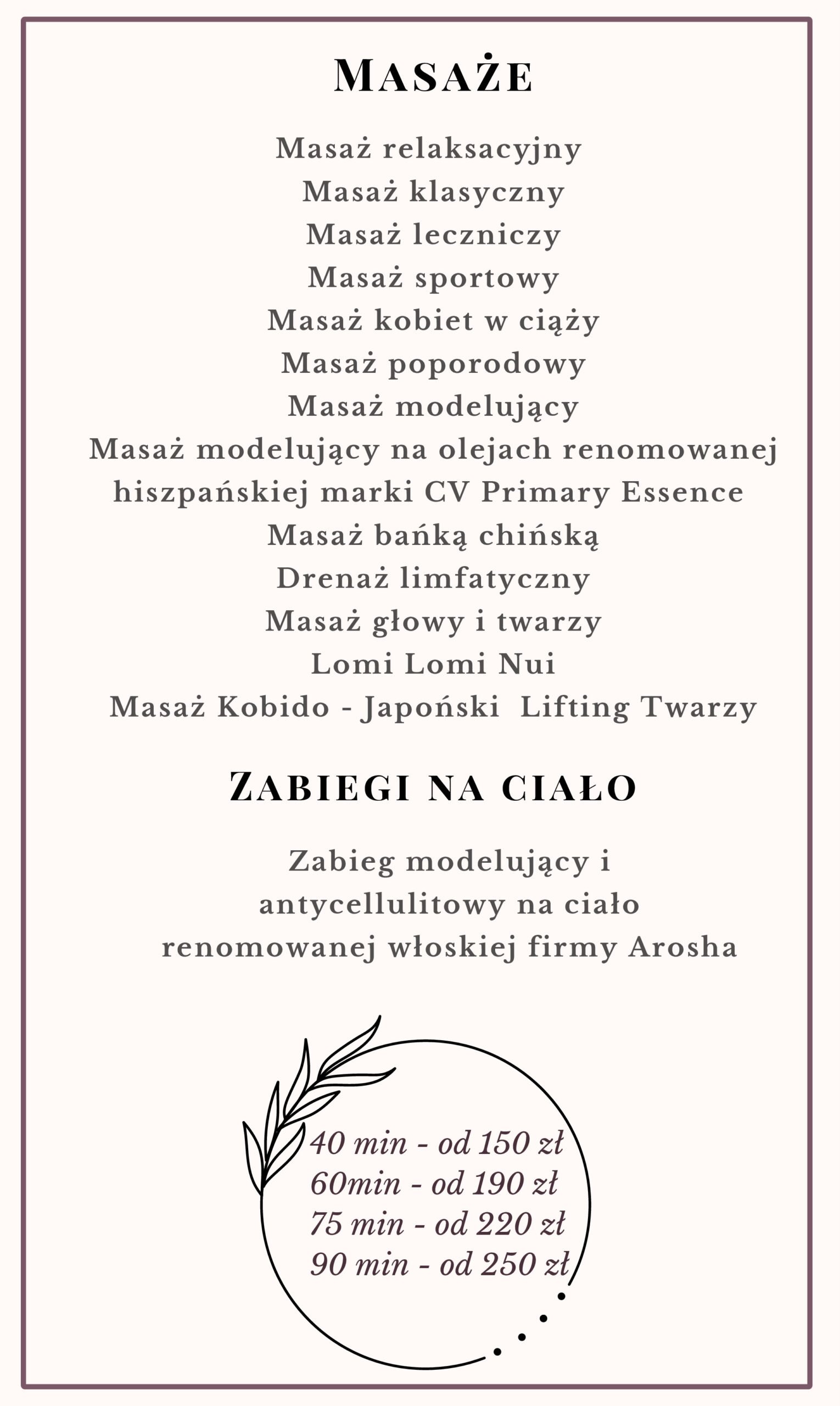 Dbając o najwyższą jakość moich usług, informuje, że w przypadku masaży i zabiegów premium ceny mogą ulec zmianie. Aktualne kwoty są zawsze dostępne na platformie do rezerwacji wizyt.